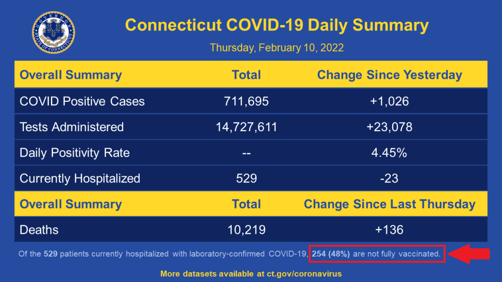 The numbers of people hospitalized with COVID in the County of Hartford went from single digits in early July, to steadily climbing upward to over a hundred on any given day by mid-August. Around that time the municipal government re-instituted the indoor mask mandate, and between September and Thanksgiving those figures went up and down between 49 and 85 hospitalized people on any given day. Then, after three major holidays with no indoor mask mandate (revoked on November 8th) we skyrocketed to 555 hospitalizations in Hartford County on January 19th. In February it’s come back down to just over 200 (half of whom are fully vaccinated, see highlighted fine print in the Daily Summary below) right back to where we were a year ago. The City of Hartford’s official death toll today stands at 385 people, up from 299 on July 1st 2021.